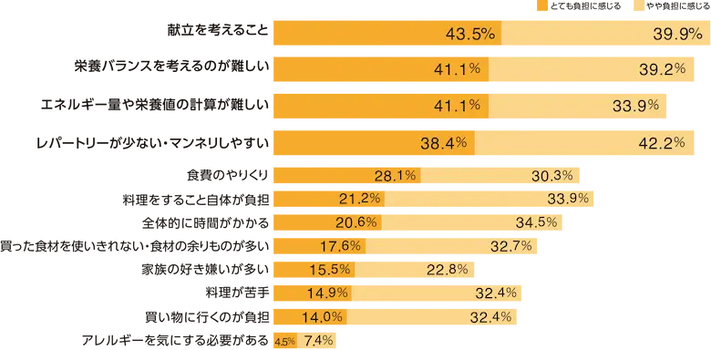 とりわけ普段の食事では、「献立を考えること」と「栄養バランスを考えること」が大きな負担となっています。