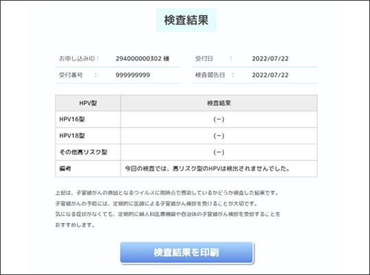 - ※本サービスは、HPV感染の有無を判定するものであり、子宮頸がんの罹患可能性の提示や診断等の医学的判断をするものではありません。