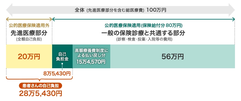 例:1か月の総医療費が100万円、うち先進医療にかかわる費用が20万円の場合